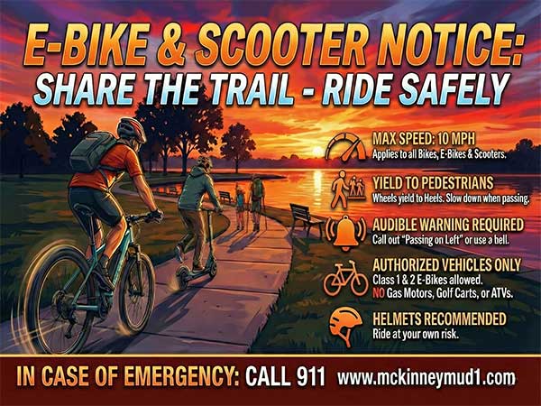 Welcome to the McKinney Municipal Utility District No. 2 website. Here, residents can find information regarding upcoming events, news, paying their water bill online, district boundaries, the board of directors, public documents from the District, contact information, and links to the following services.